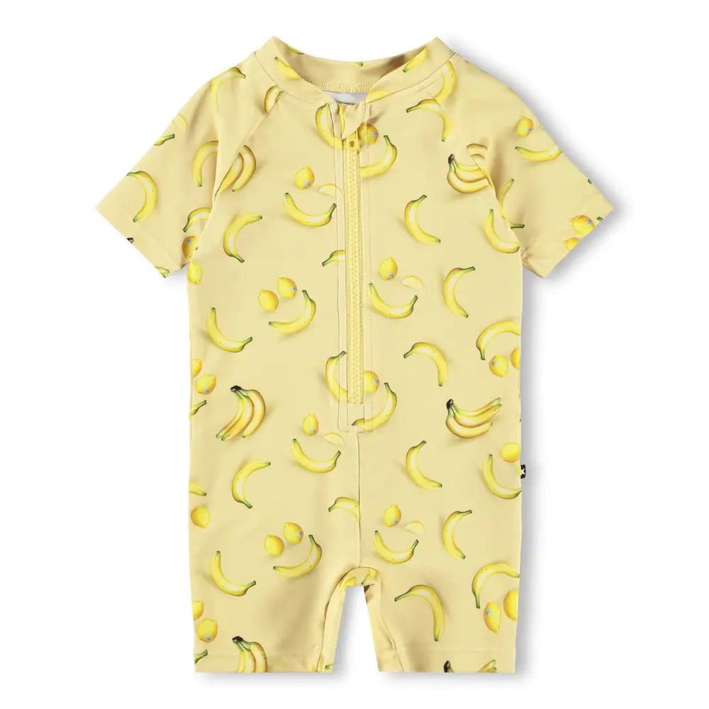 Neka Badedragt fra Molo i Lemon Banana-print er perfekt til sommerens vandlege og strandture. Dragten har korte ærmer og ben, hvilket giver god bevægelsesfrihed, mens lynlåsen foran gør det nemt at tage den af og på. Det bløde og strækbare materiale i pol
