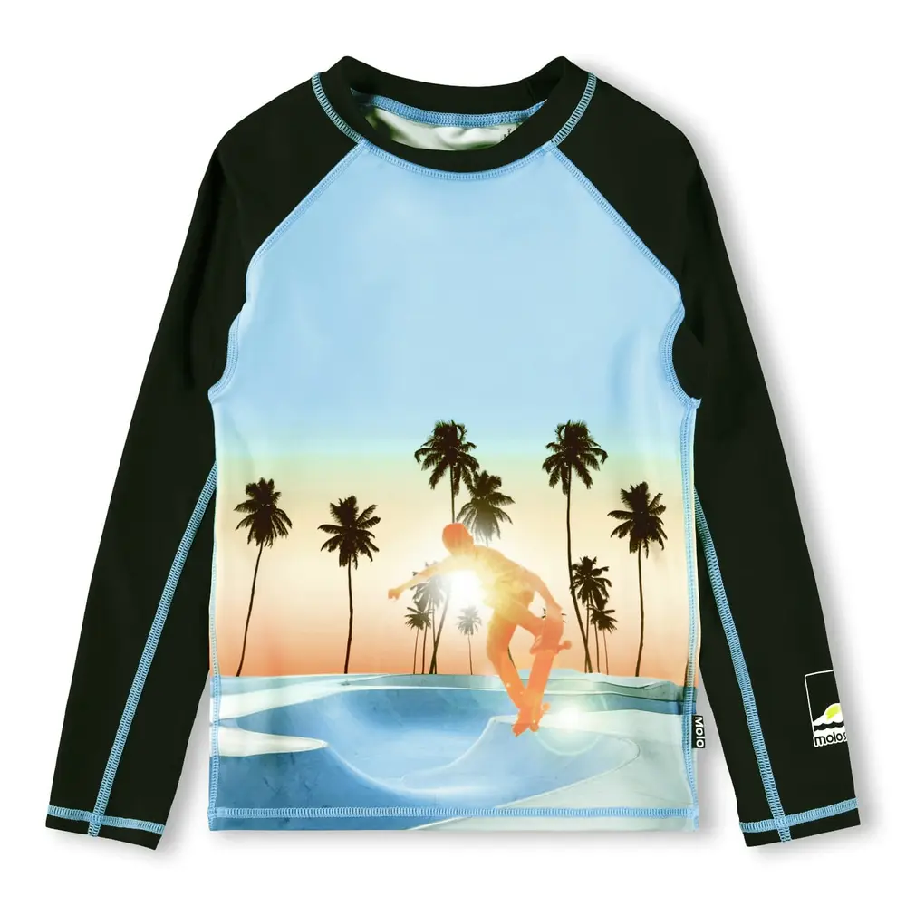 Molo Neptune Badetrøje – Sunrise Skate er den perfekte badetrøje til aktive børn, der elsker at lege i vandet og under solen. Trøjen har et sejt print med skateboarder og palmer i solopgang, som giver et friskt og sporty look. Materialet er en blanding af